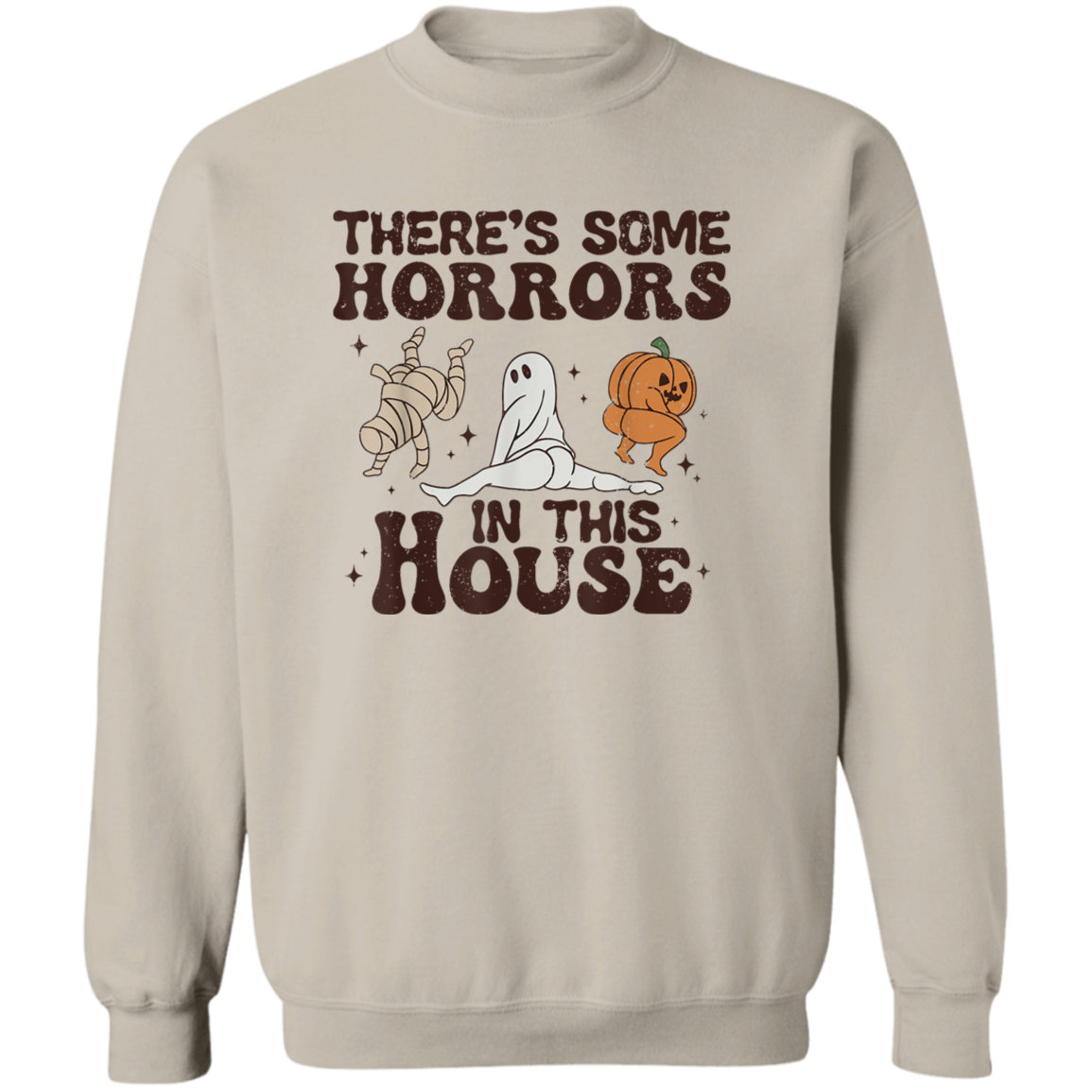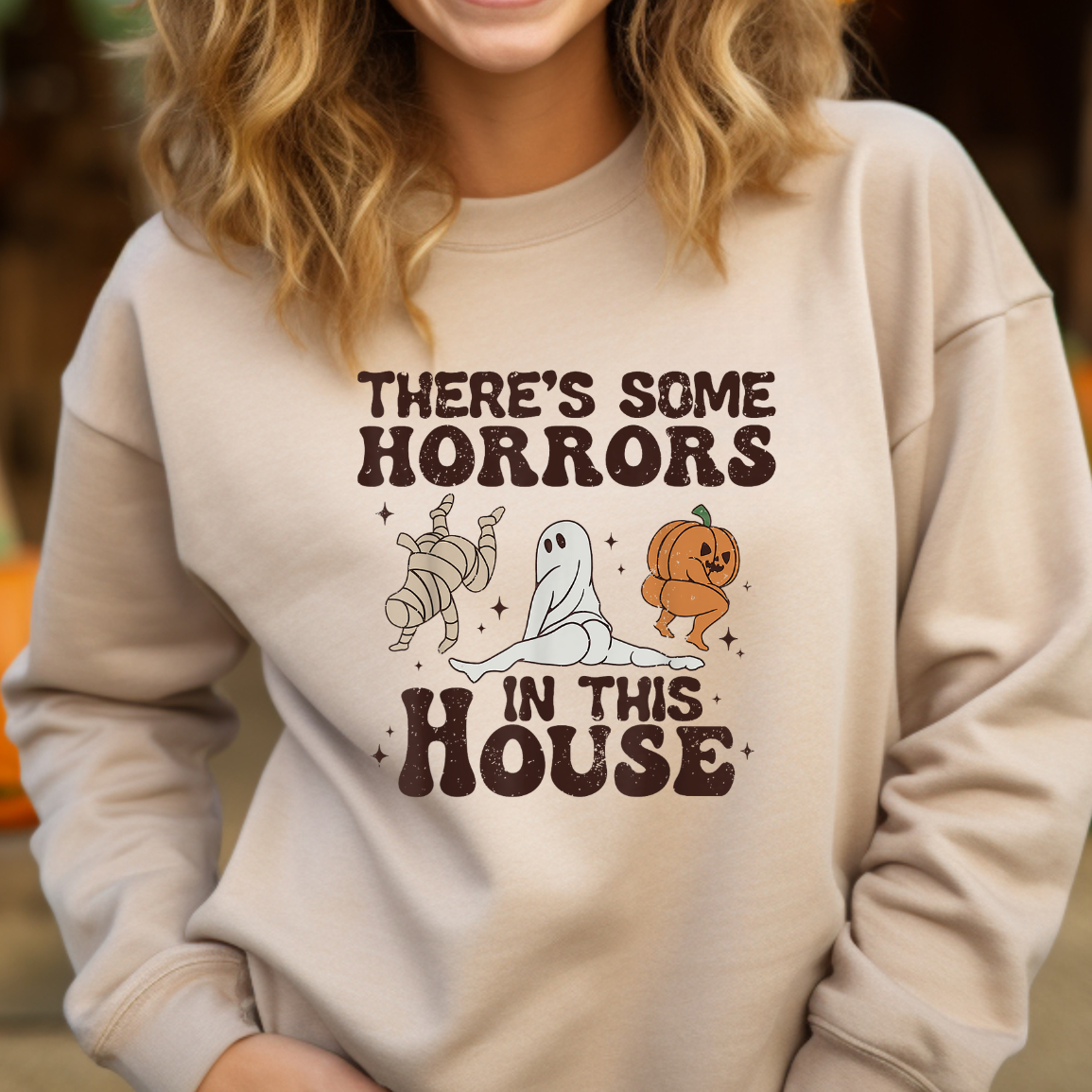 This Halloween, make a statement with our Horrors In This House Sweatshirt! It's the perfect spooky-chic outfit for your festive holiday plans. Show your friends and family that you ain't scared of no ghost (or zombie, or mummy). Whether you're trick-or-treating or attending an epic Halloween party, you're guaranteed to look wicked awesome in this ghoulish garment!