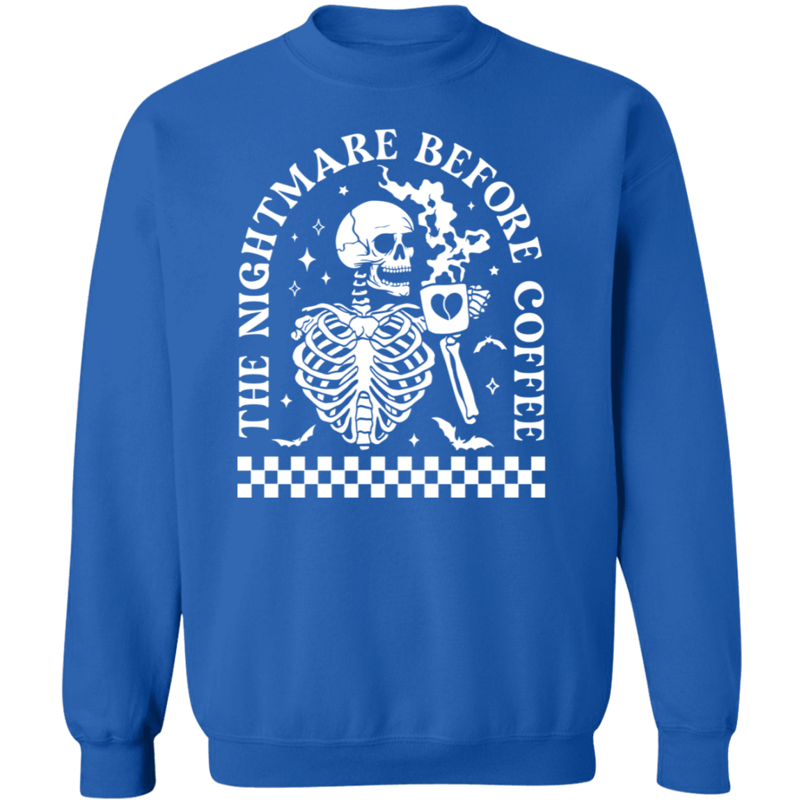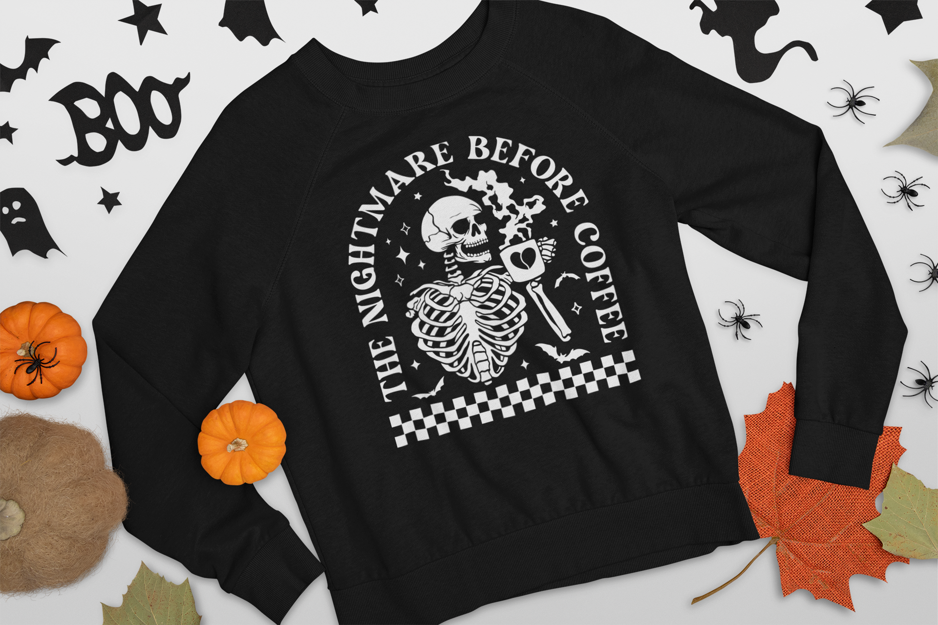 Wake up your wardrobe with this hilarious Nightmare Before Coffee Sweatshirt - perfect for days when you need that extra jolt of energy! Give the gift of laughter to yourself or your caffeine-loving friends with this cozy top that features a skeleton drinking coffee and the punniest of sayings. Get it now and start brewing up some smiles!