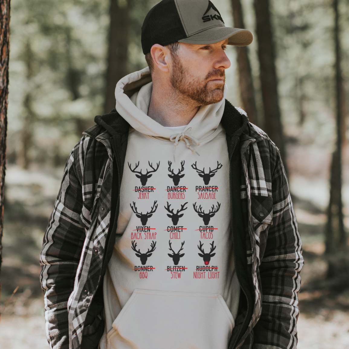 This festive hoodie is perfect for the hunter in your life! Sporting witty illustrations of Santa's reindeer as cuts of meat and favorite recipes, this is the must-have gift for any outdoorsmen.