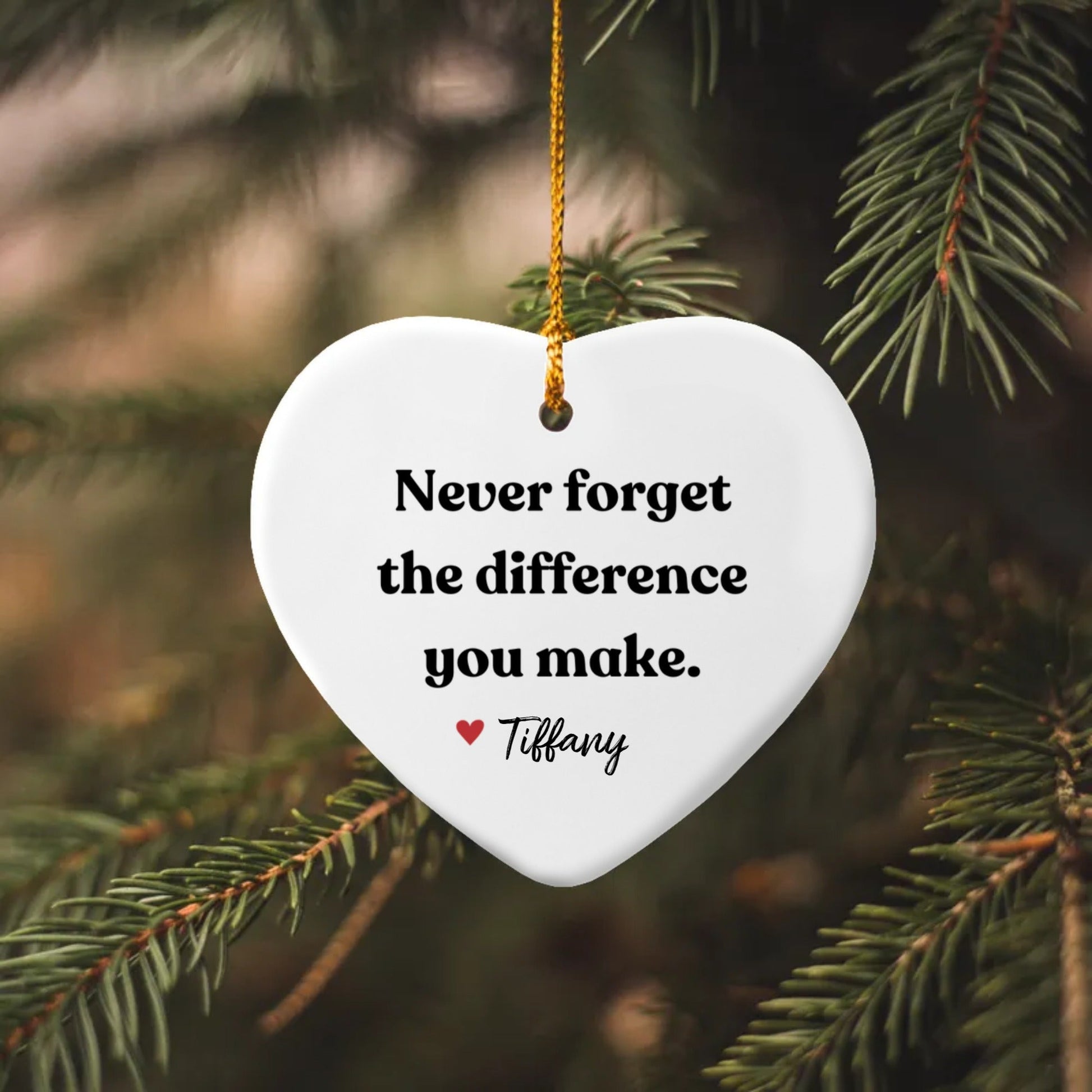 This heart-shaped ornament is the perfect way to remind someone special just how much of a difference they make. The phrase "Never Forget The Difference You Make" is inscribed on the ornament, creating a subtle yet powerful reminder of their impact.